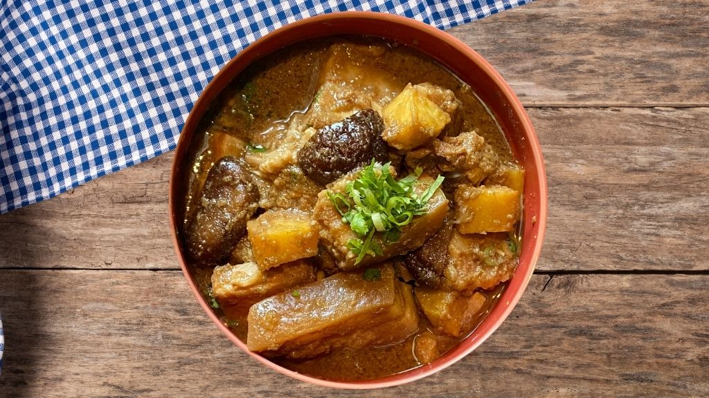 A comforting braised pork dish cooked with fermented soybean paste, garlic, and other aromatics, resulting in a sweet and savory flavor.